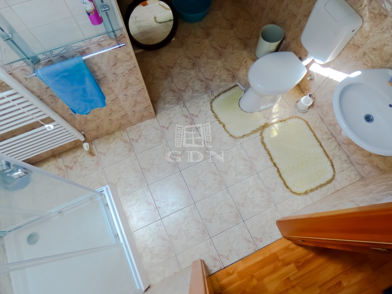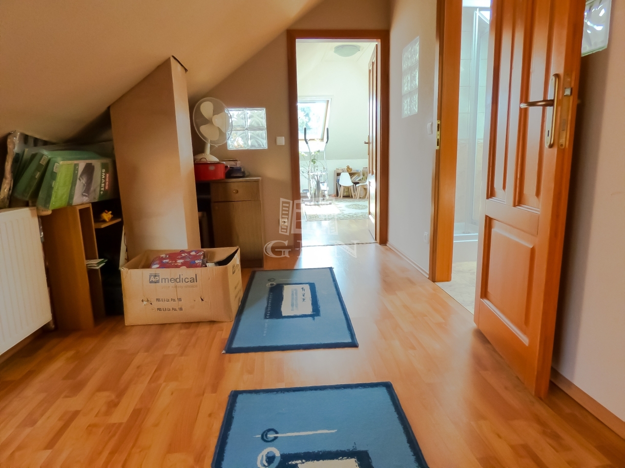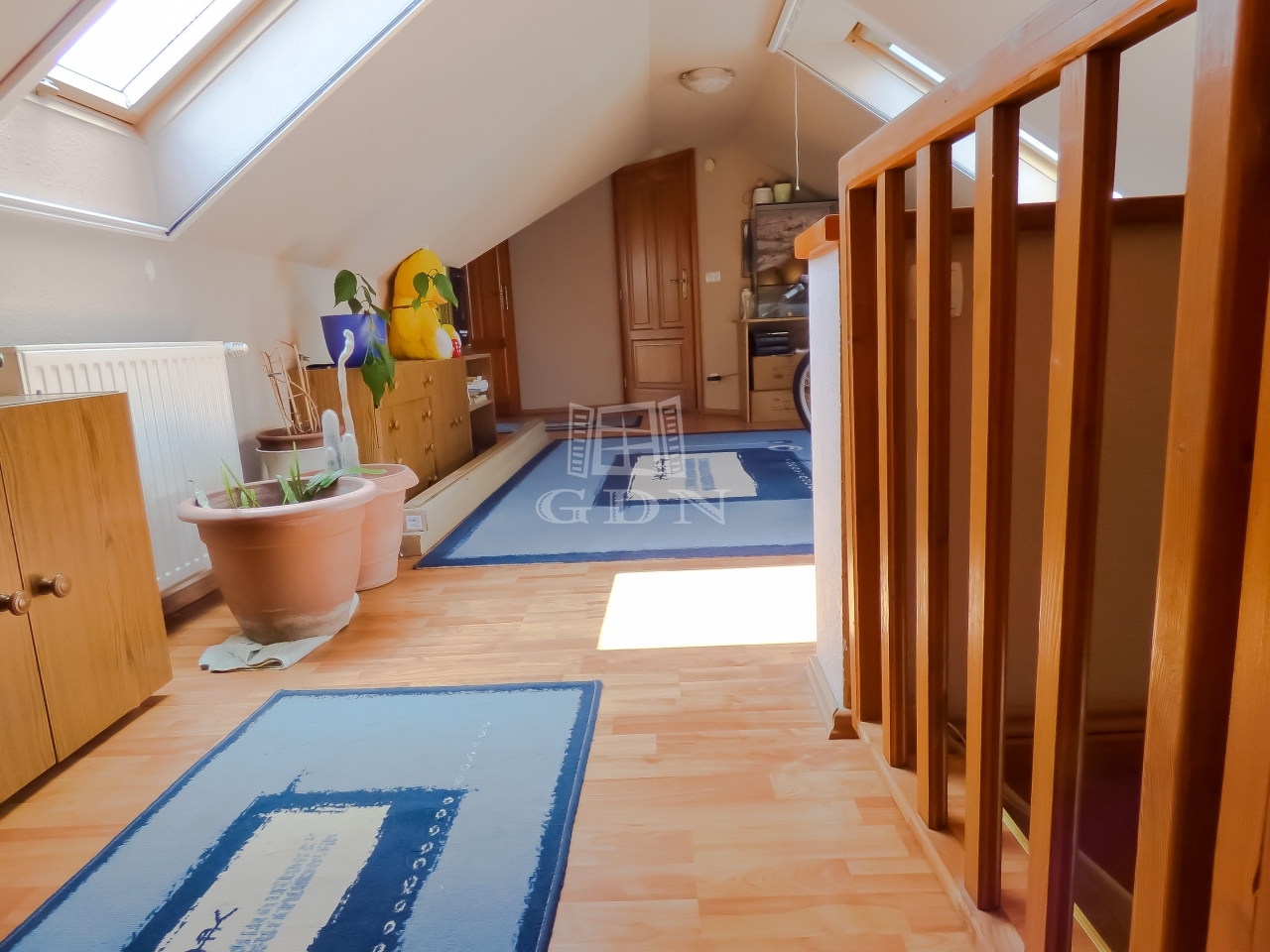 Az emelet nagy nappali, hálószoba, konyha (amely jelenleg gardrobeként funkcionál), fürdőszoba kialakítású.