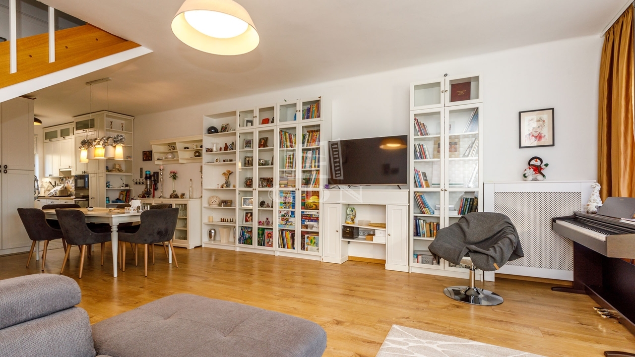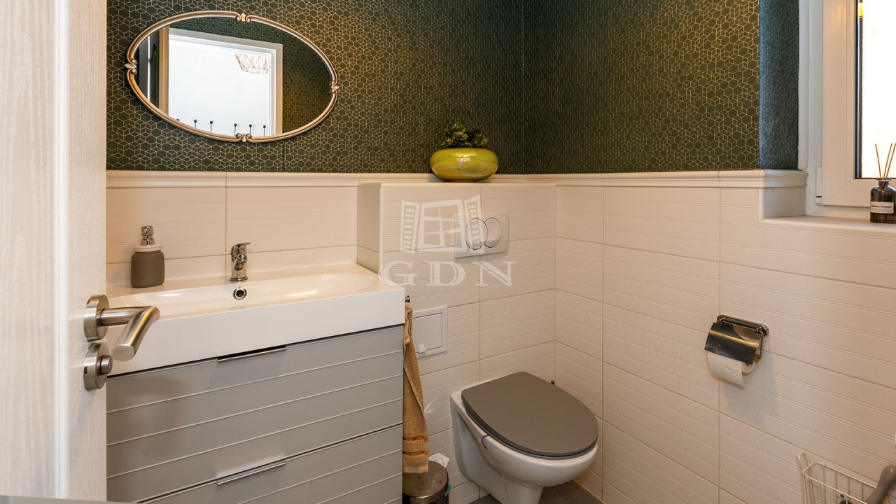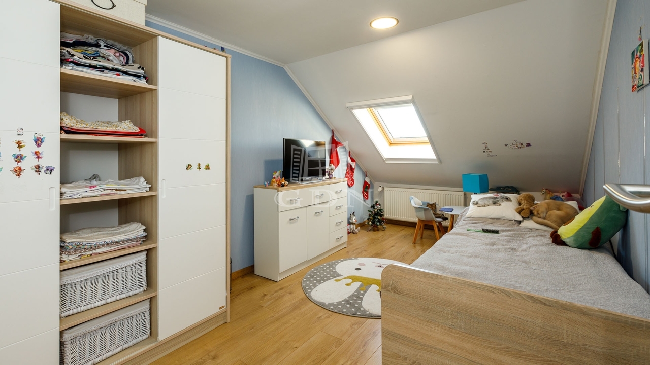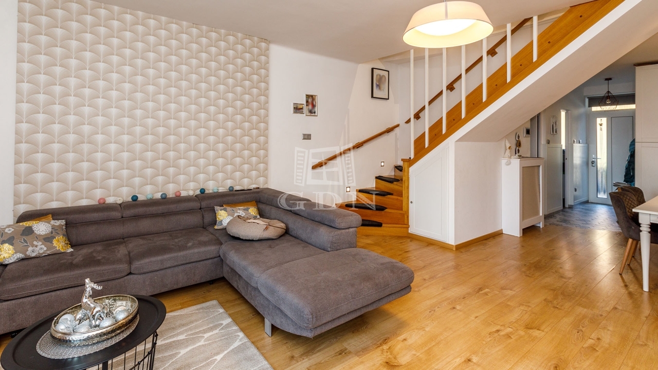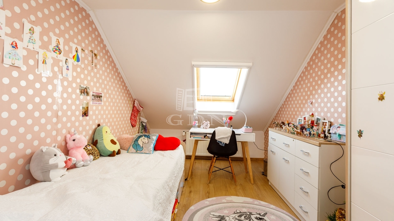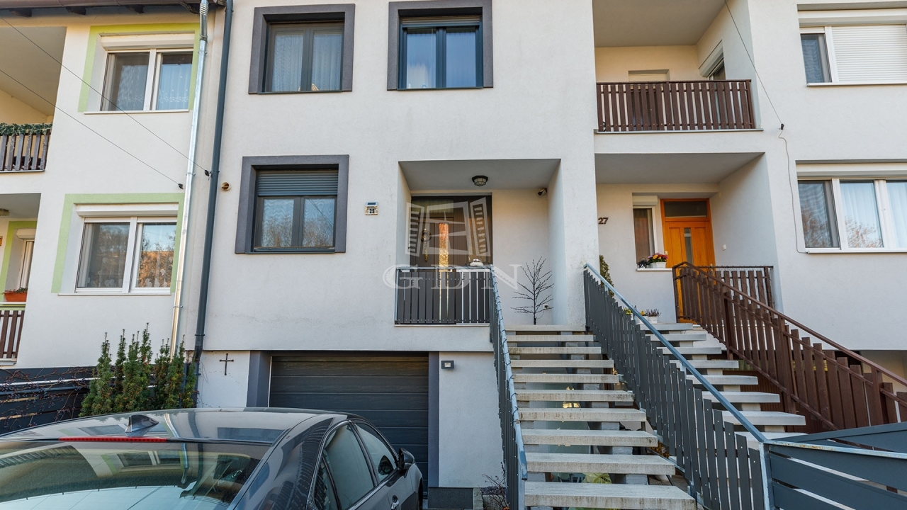 Ez a téglaépítésű ingatlan több szinten kínál tágas életteret, gondosan megtervezett belső terekkel. A földszinten egy szoba, konyha, tároló és fürdőszoba került kialakításra míg a többi három szinten további öt szoba, egy nappali egy konyha és két fürdőszoba áll rendelkezésre. A házhoz egy kertre néző erkély is tartozik az első szinten. Az autók elhelyezése garázsban és a ház előtt lehetséges.