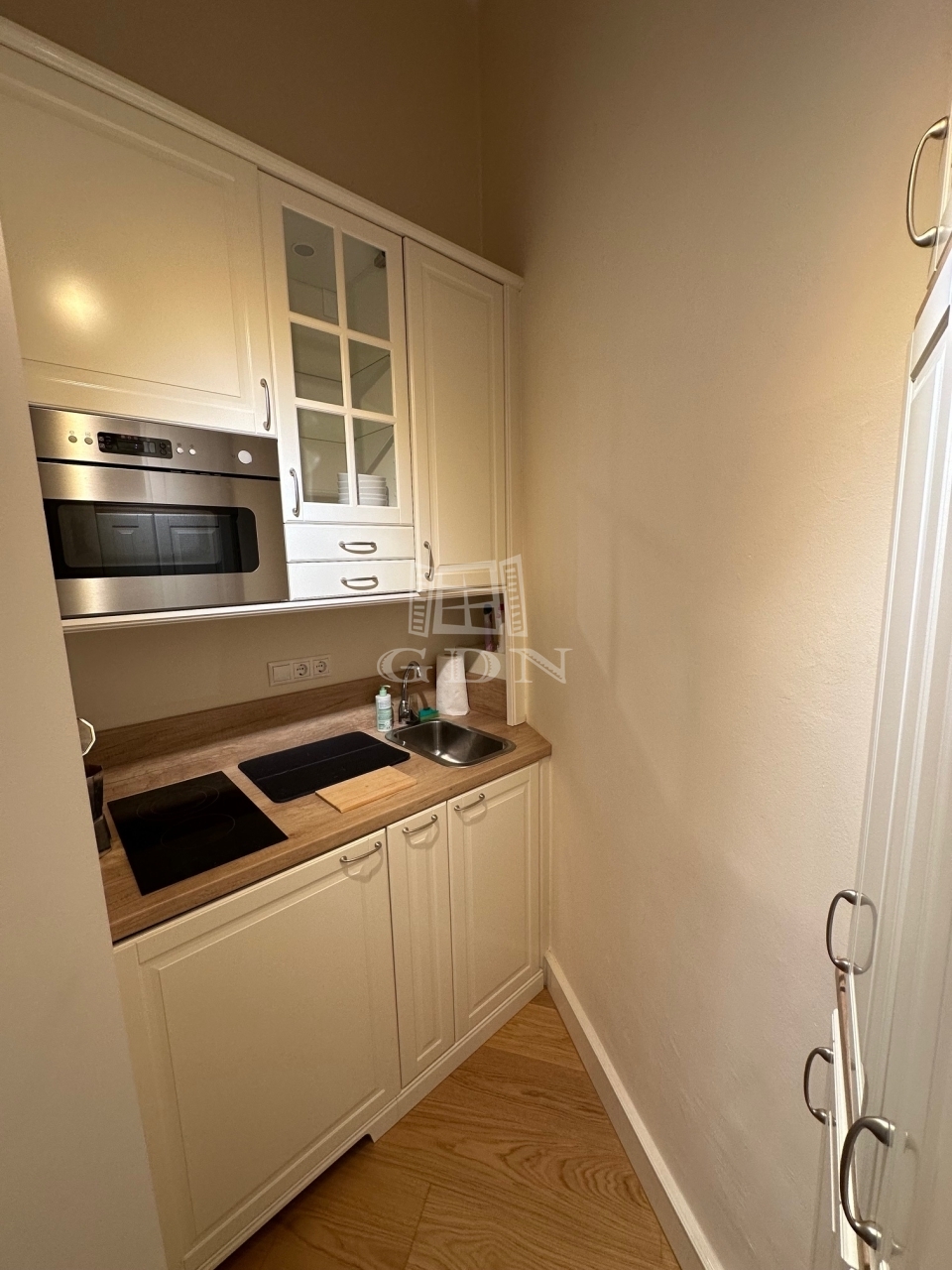 A lakás a második emeleten helyezkedik el, belépve egy étkező részbe érünk, ahol beépített szerkények állnak a rendelkezésünkre.