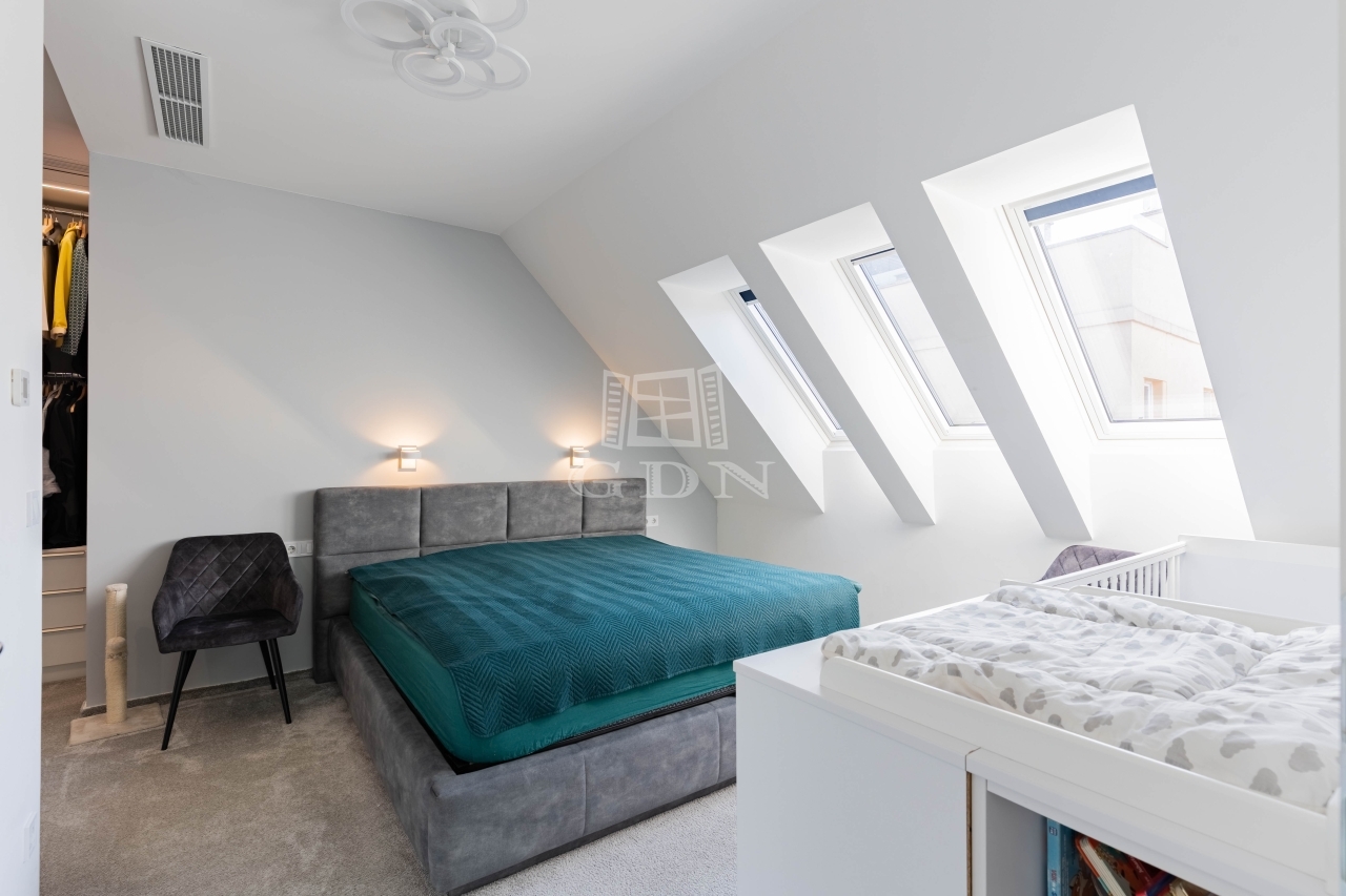 A lakás különlegessége a belső kétszintes kialakítás, amely tágas, jól elkülönülő élettereket biztosít.