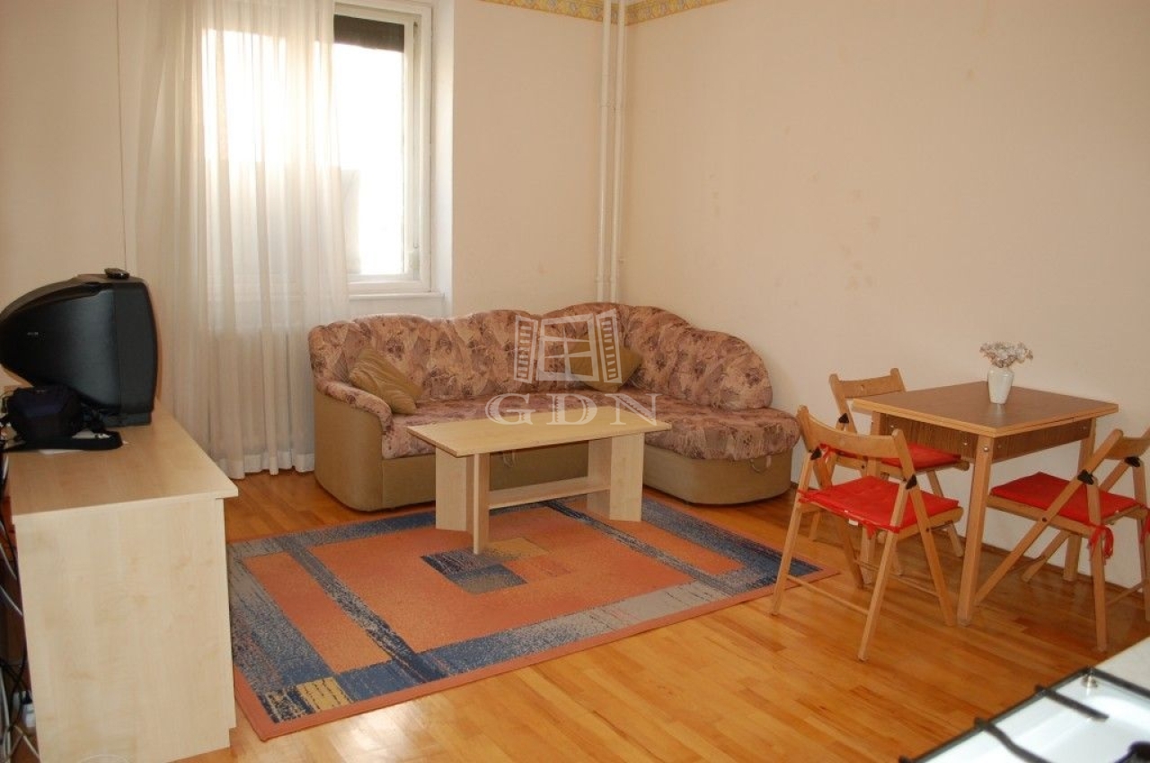 A lakás elrendezése: az előszobából nyílik külön egy amerikai konyhás nappali + hálófülke egy kis gardróbbal és egy fürdőszoba toalettel.