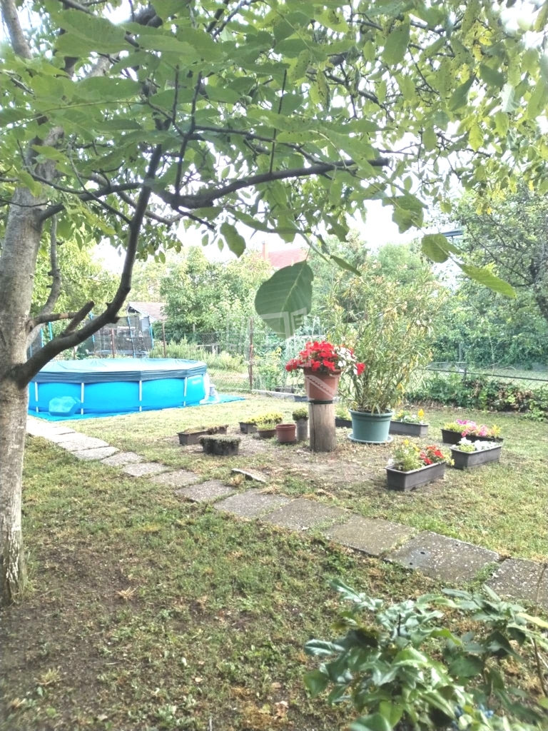Tágas kert: örökzöldek, diófa és rózsabokrok biztosítják a nyári árnyékot és a privát pihenést!