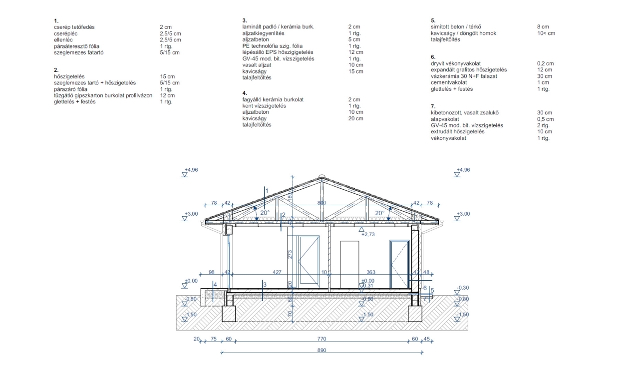 Az épület Porotherm 30-as tégla falazattal, 14 cm-es grafitos homlokzati szigeteléssel és 30 cm vastag tetőszigeteléssel készül. A fűtést és a melegvizet 12 kW-os hőszivattyú biztosítja, a teljes ingatlanban padlófűtéssel, míg a hűtést fancoil egységek látják el.