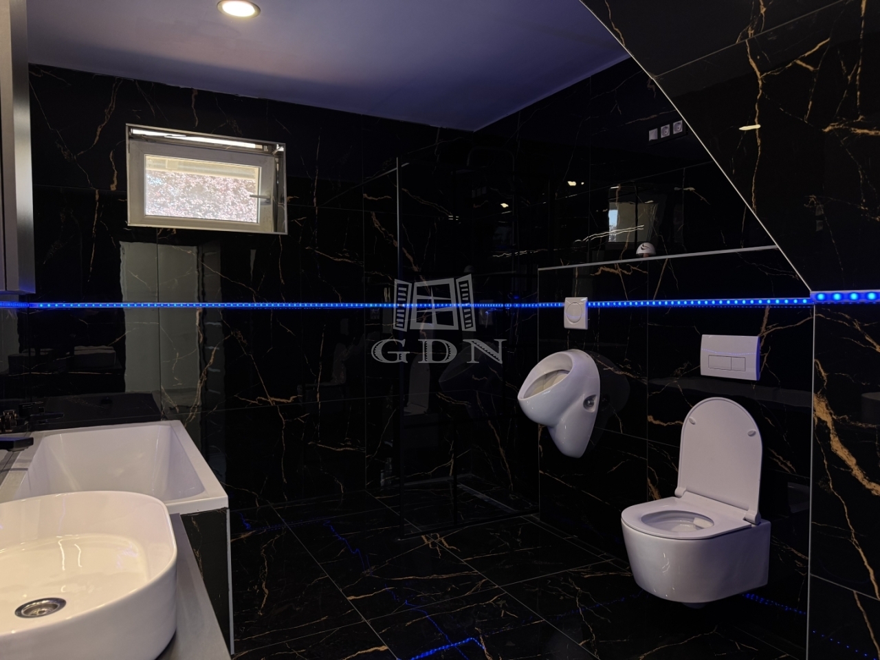 Egy gépesített, közel 50 m2-es amerikai konyhás nappali, egy szülői háló gardróbbal és fürdőszobával, kettő hálószoba, fürdőszoba, kazánház és egy nagyobb, mint kétállásos garázs lett kialakítva. A házhoz kapcsolódik egy 16m2-es fedett terasz is.