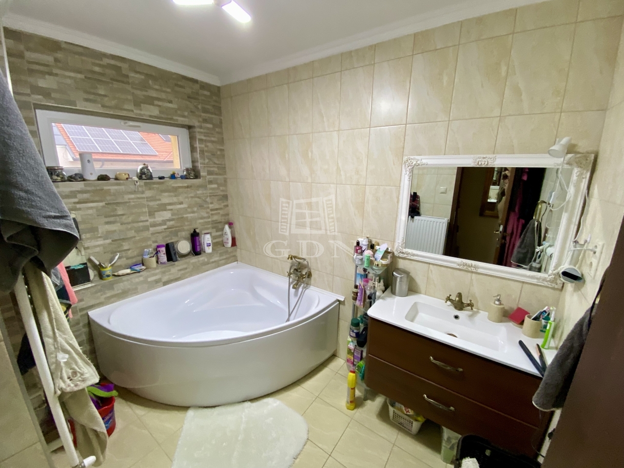 A földszinten egy világos, kertkapcsolatos konyha–étkező fogadja az érkezőket, amely közvetlenül kapcsolódik a nagy méretű nappalihoz – ez a tér a családi élet természetes központjává válik. Itt kapott helyet a sarokkáddal felszerelt fürdőszoba is, valamint egy külön helyiségben kialakított WC és bidé.