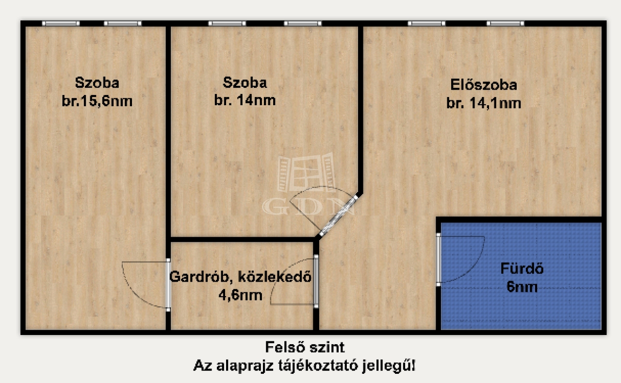 A felső szintre egy kényelmes fokkiosztású lépcsőn juthatunk fel, ahol is a br. 14nm terjedelmű világos előszoba (itt akár külön dolgozó vagy közösségi tér is kialakítható) valamint a 6nm-es kádas duplamosdós fürdő, kettő egyenként br.15,6 és 14nm terjedelmű hálószoba és egy közel 5nm es gardrób került kialakításra.