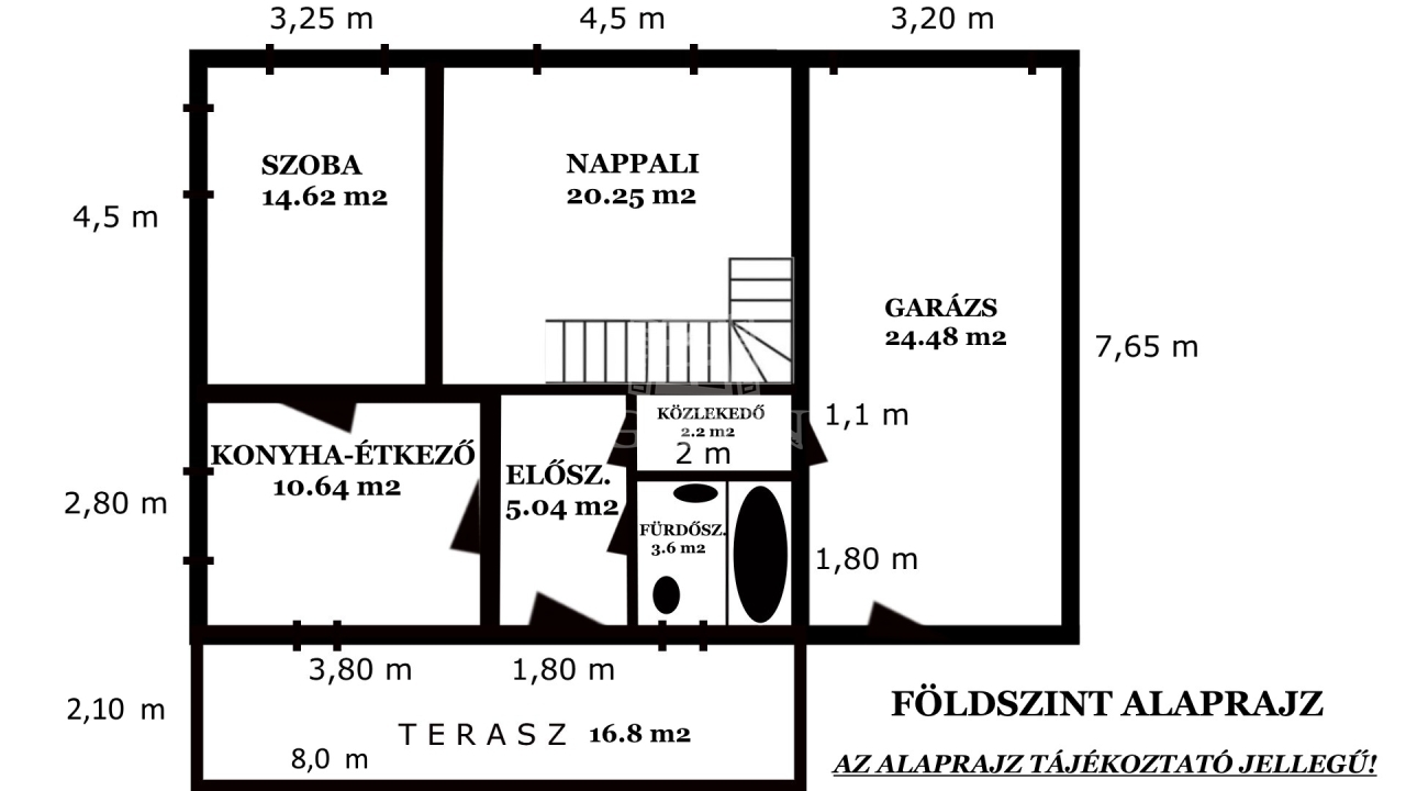 Az ingatlan jelenlegi teljes alapterülete a földszinten 80,83 m² ( garázzsal együtt), ebből a nettó hasznos lakóterület 56,35 m² + a terasz (1/2 része) 8,4 m² azaz összesen 64,75 m².