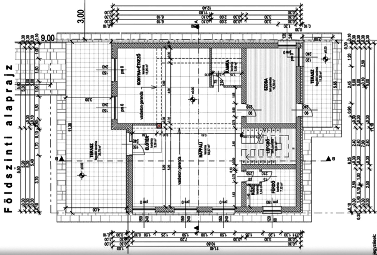 A földszinti terasz a bejáratnál közel 40 m2-es.