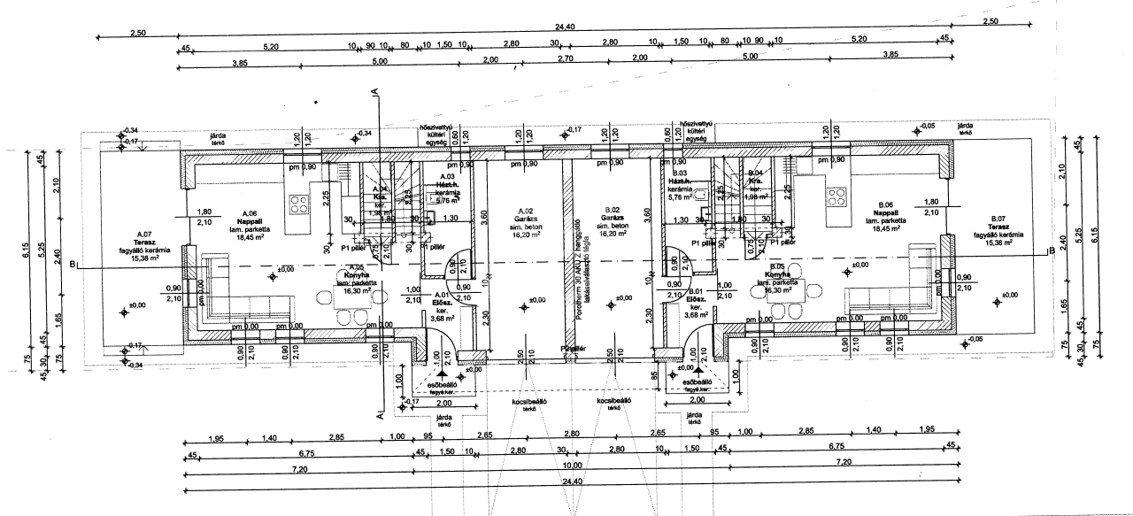 amerikai nappali+konyha 34,75 m2, terasz 15,38 m2.