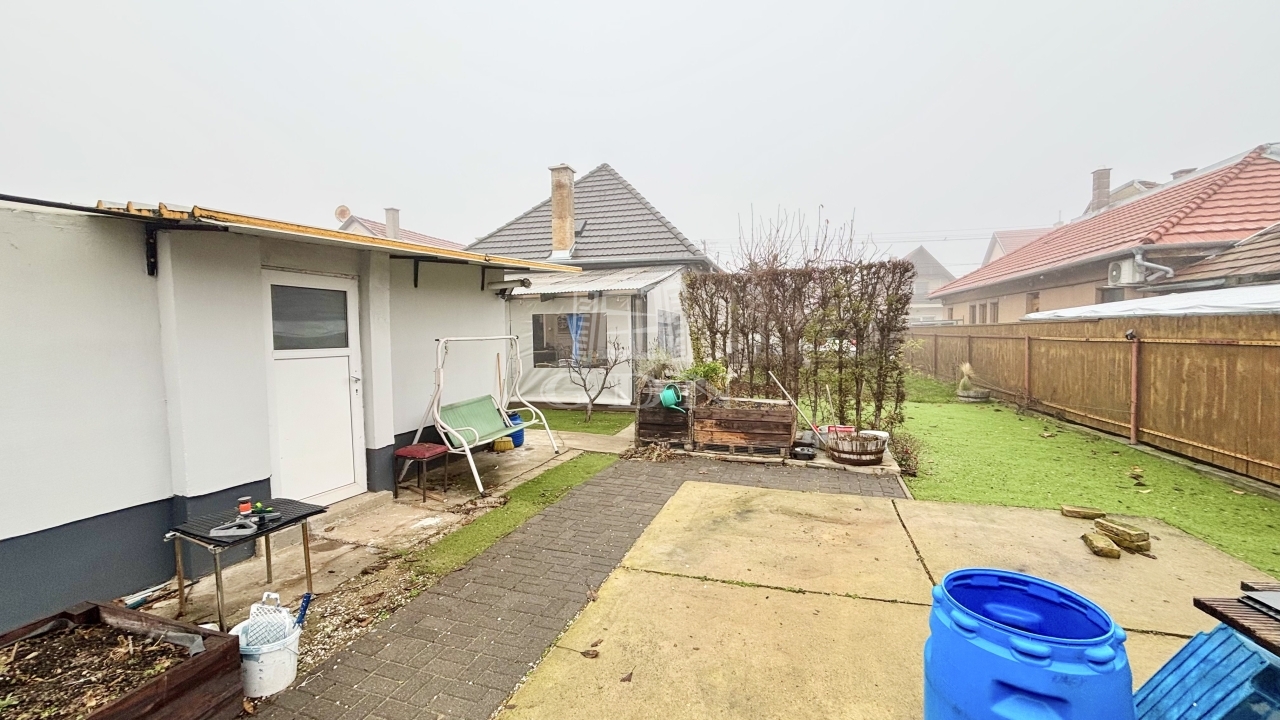 A kényelmesen karban tartható kertben helyet kapott egy fedett gépdcsibeálló, de ezen kívül 1 autó is kényelmesen elfér. Öntözésről egy ásott gyűrűs kút gondoskodik.
