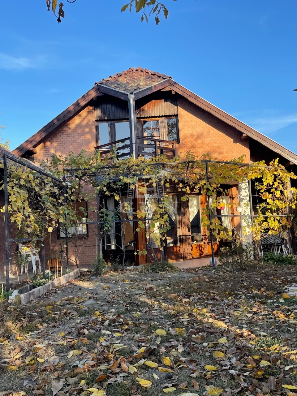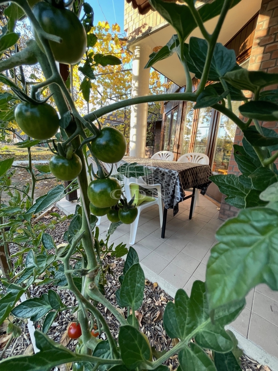Nyáron szőlőlugas és speciális tetőszerkezet gondoskodik az árnyékról, télen pedig a hőszigetelt üvegezésű nyílászárók segítik a nap melegének megtartását.