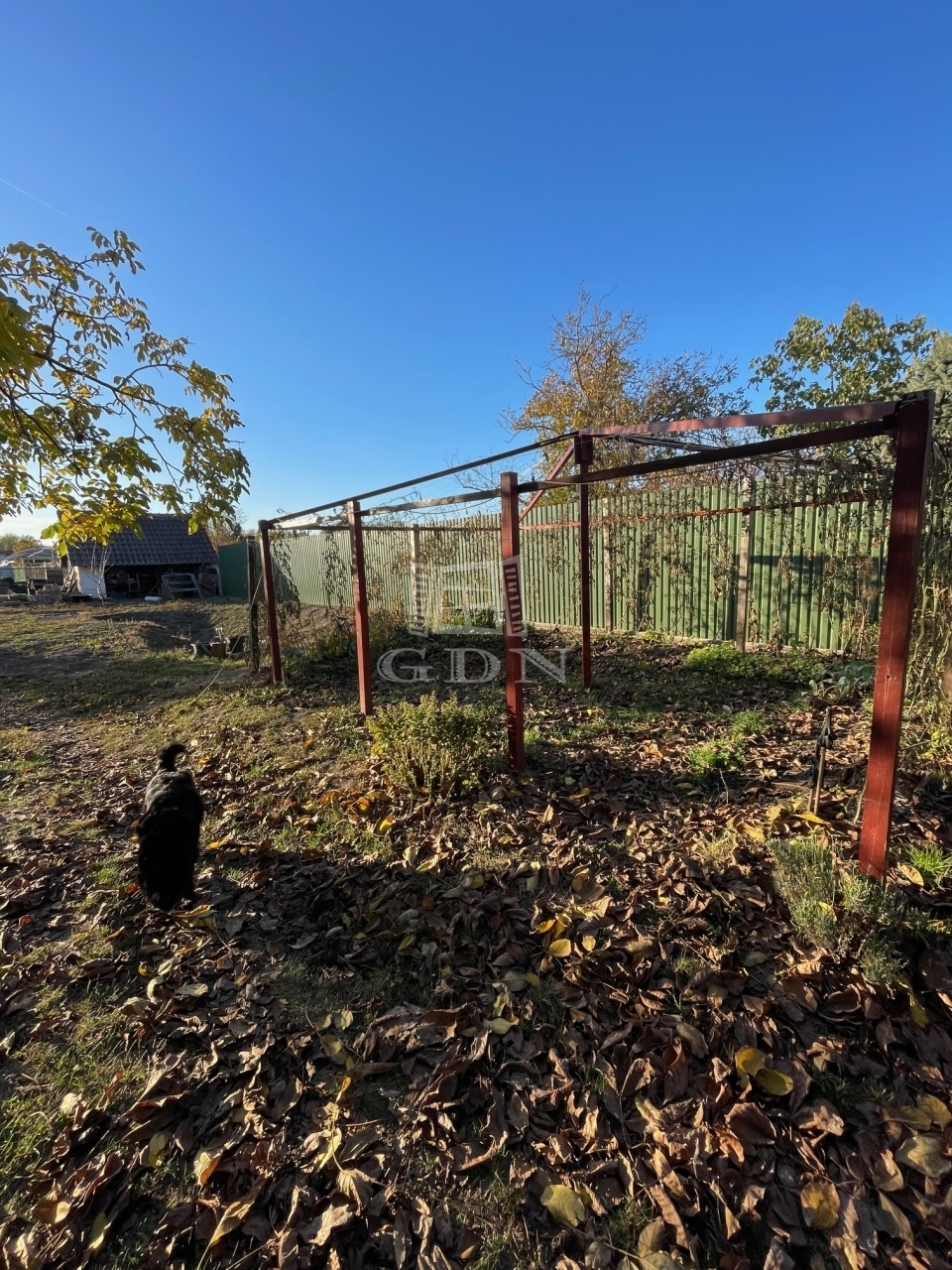 A kertben gyümölcsfák, sövények és egy kerti ház is található, ami igazán barátságossá teszi a környezetet.
