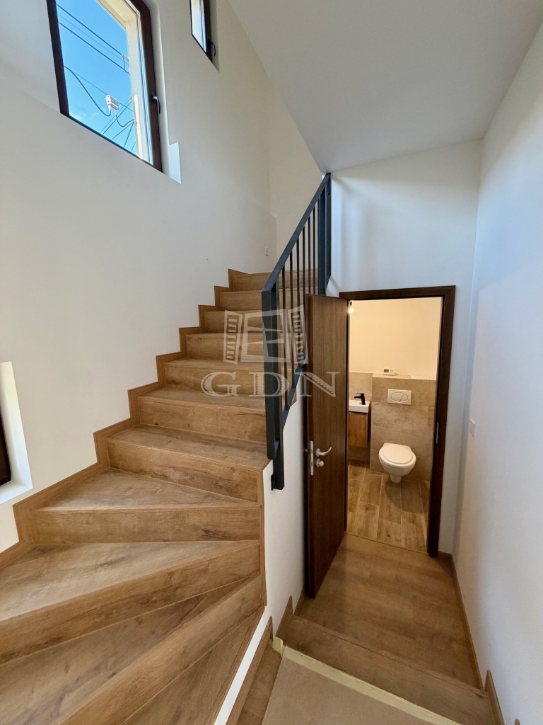 Az emeleti szinten két hálószoba, egy fürdőszoba és egy erkély található, már elektromos redőnyökkel felszerelve.