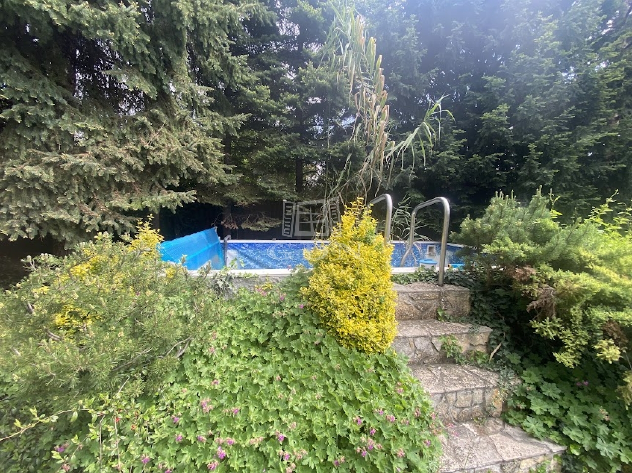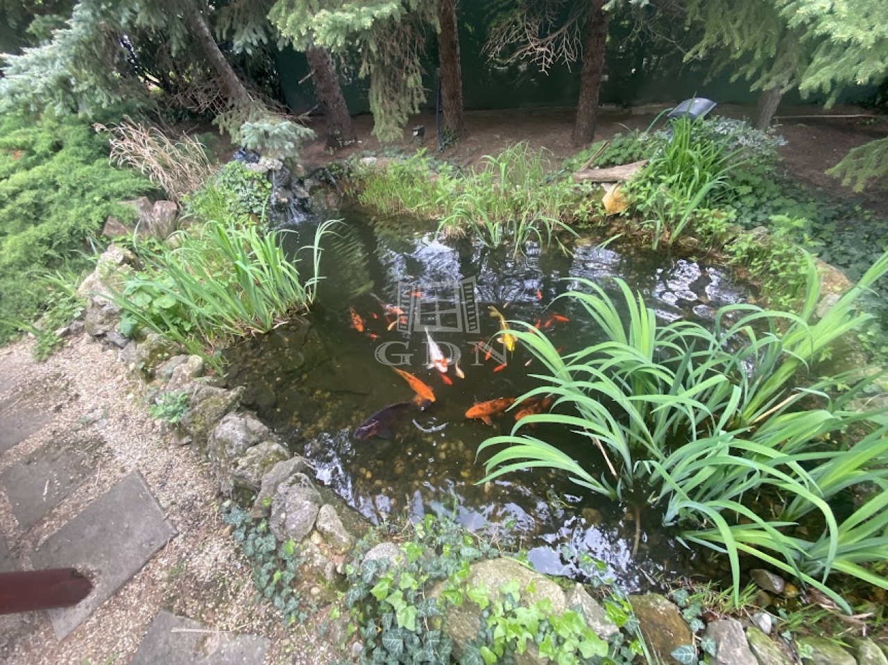-kerti tárolókkal, sütőhellyel, kerti tóval, medencével rendelkezik