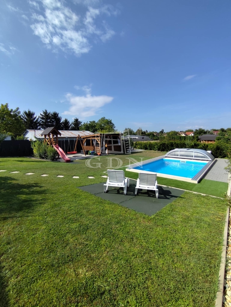 Medence, szaletli, kerti sütő, szépen gondozott kert és növények.