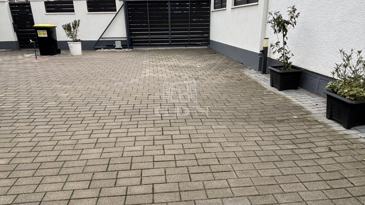 10 cm-es szigetelés, viacolorral burkolt kocsibeálló, több autó részére, elektromos kapu és megfigyelő-rendszer.