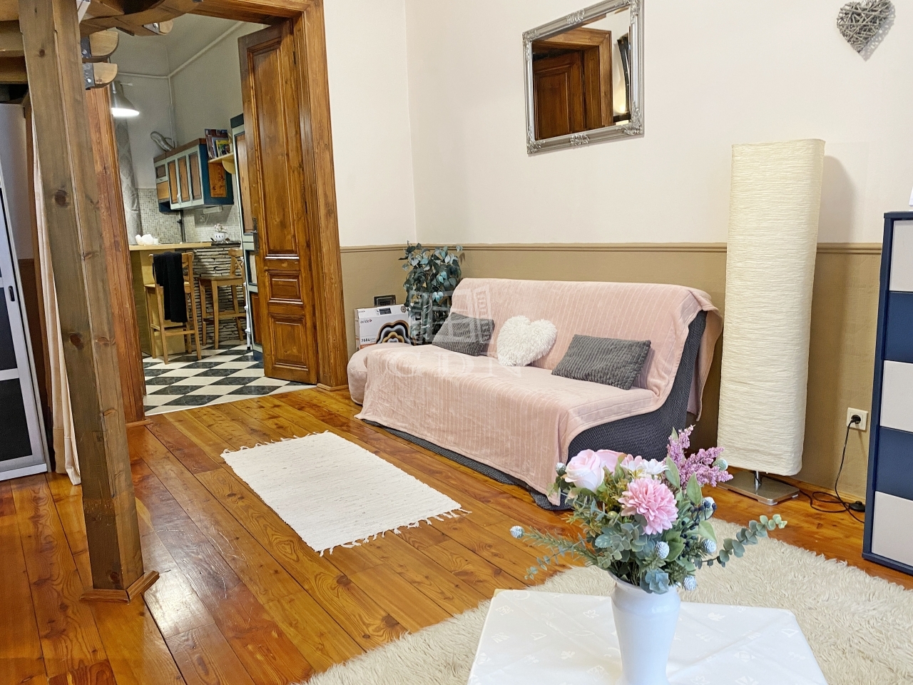 A szoba burkolata vörös fenyő, a konyha, fürdőszoba a lakás hangulatához alkalmazkodó járólap burkolatot kapott.