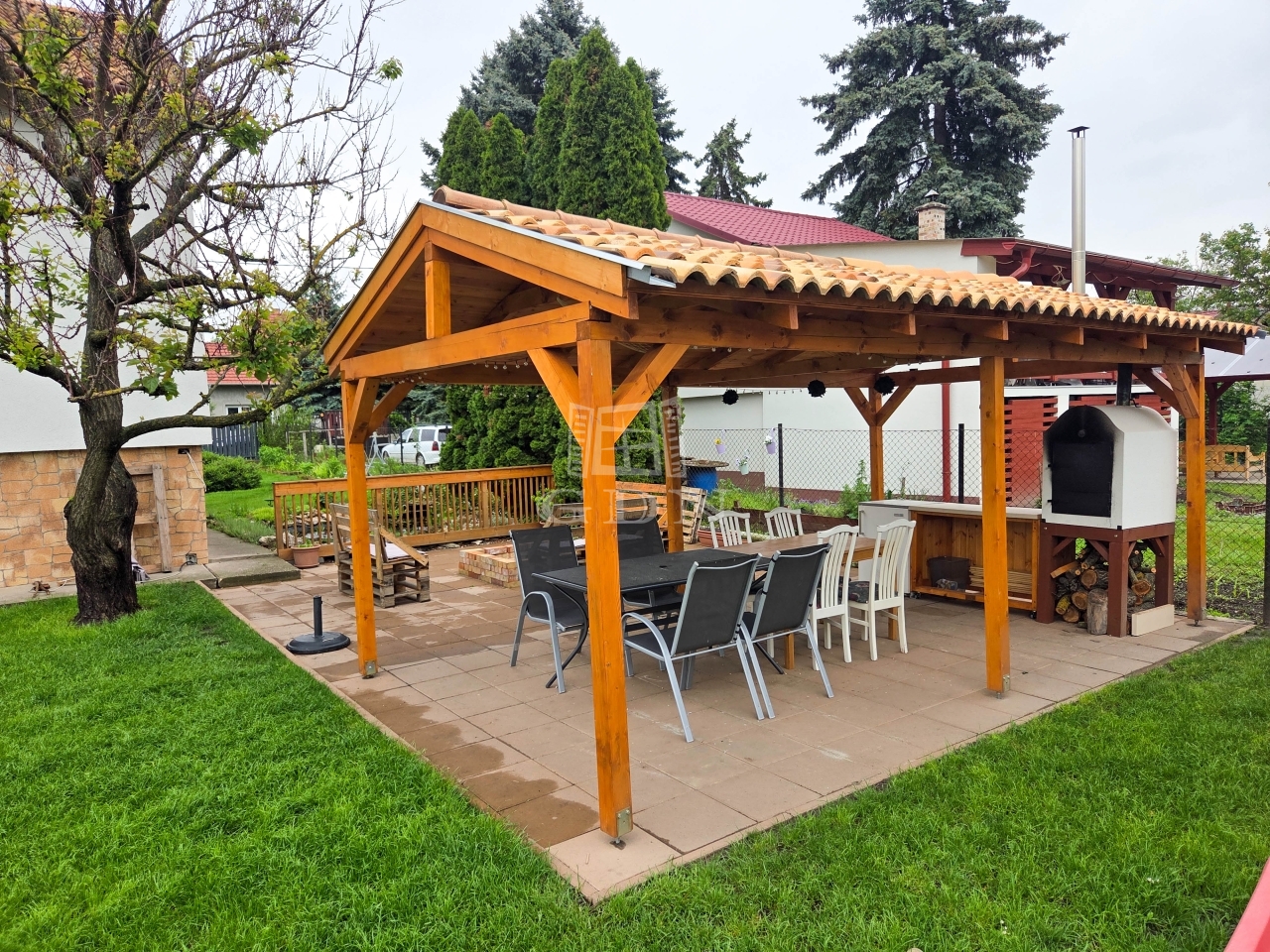 Az udvarban egy tágas fedett terasz / szaletli is található, ami tökéletes helyszíne lehet családi összejöveteleknek vagy baráti grillezéseknek.