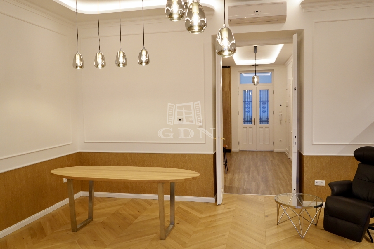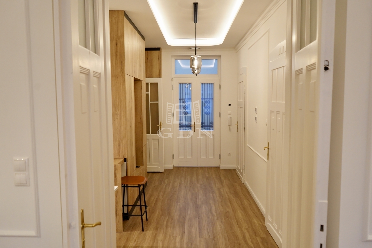 A 3,2 méteres belmagasság, a klasszikus halszálkamintás tölgyfa parketta és a felújított, patinás beltéri ajtók időtálló nagypolgári hangulatot teremtenek, amely harmonikusan kapcsolódik a modern megoldásokhoz. Az enteriőr kifinomultságát designlámpák és gondosan kiválasztott burkolatok erősítik, egységes és elegáns összképet alkotva.