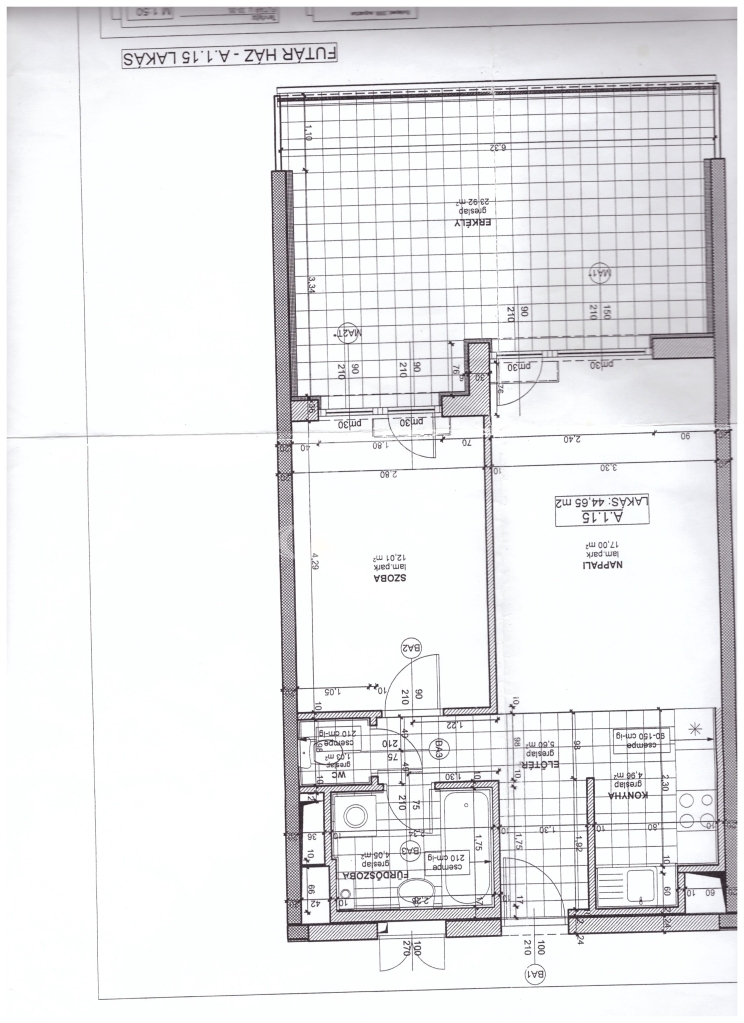Tulajdoni lapon 45 m² lakótér (amerikai konyhás nappali és 2 háló) + 24 m² beépített erkély