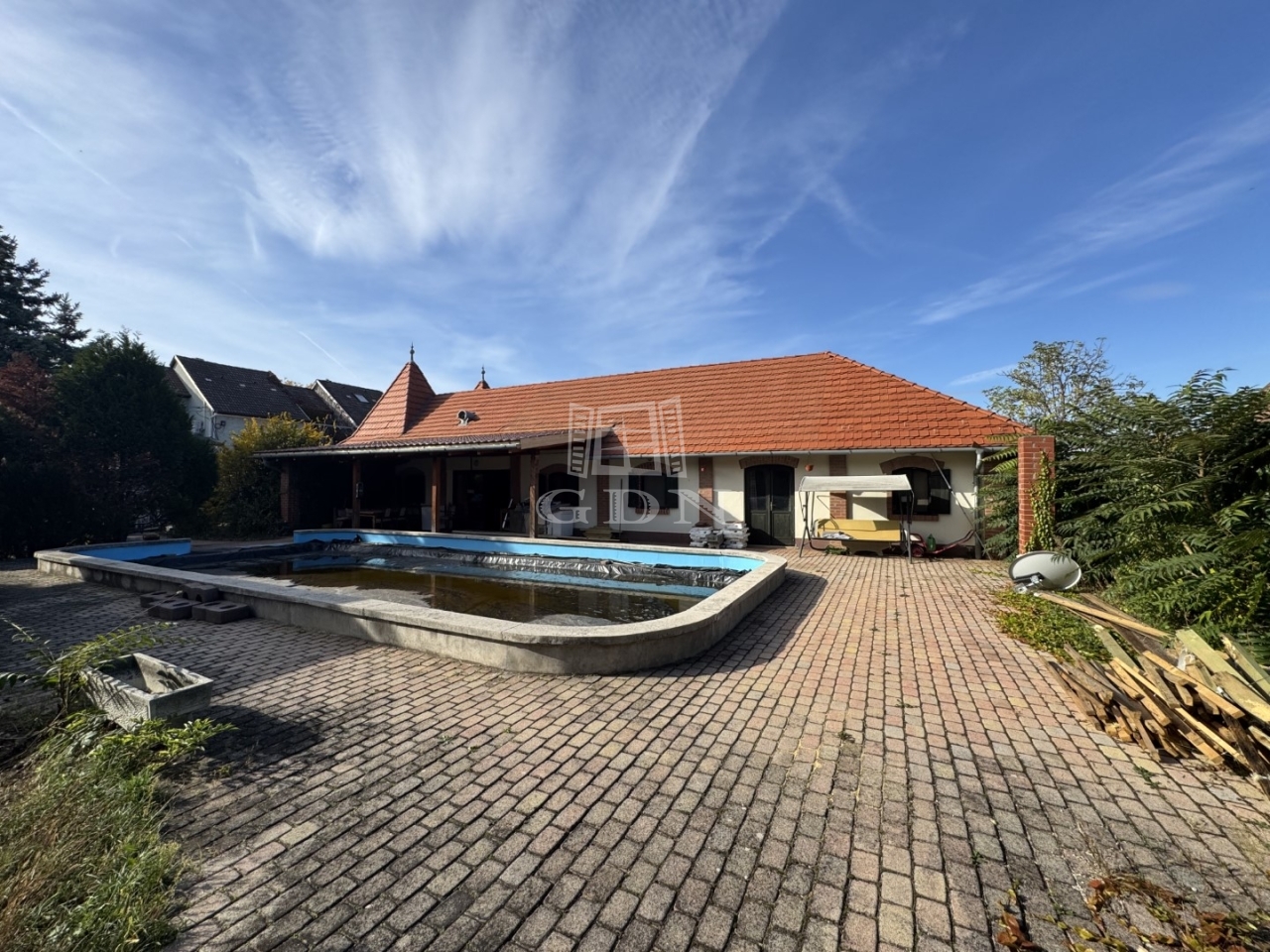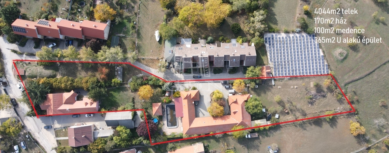 T-004808. Székesfehérváron, Öreghegyen, részben panorámás , 4044m2 –es építési telek 110m2-es családi házzal, 100m2 medencével, 365m2-es „U” alakú épülettel eladó!