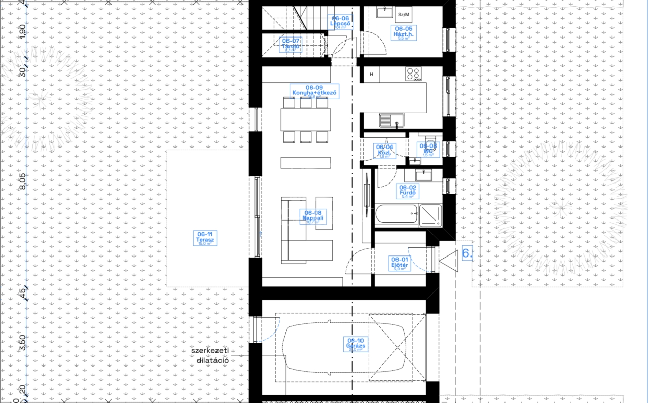 kertrész kb. 200 nm. A garázs teteje monolit födém, járható,
